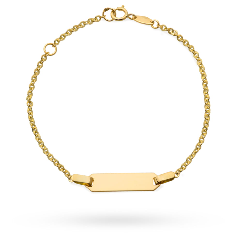 Elegancka i stylowa złota dziecięca bransoletka próby 585 na łańcuszku z blaszką na łańcuszku. Doskonała do grawerowania na prezent z okazji chrztu, pierwszej komunii czy też innej okazji.