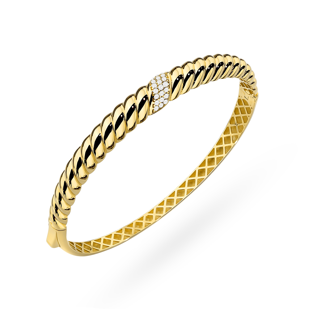 Bransoletka złota sztywna pleciona zdobiona cyrkoniami na środku