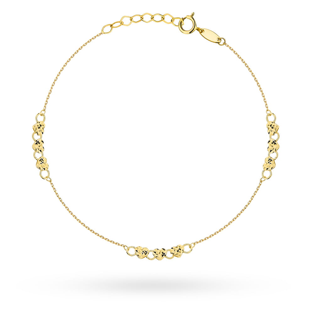 Precyzyjnie wykonana złota bransoletka próby 585 z serduszkami z diamentowanym przodem i gładkim tyłem.