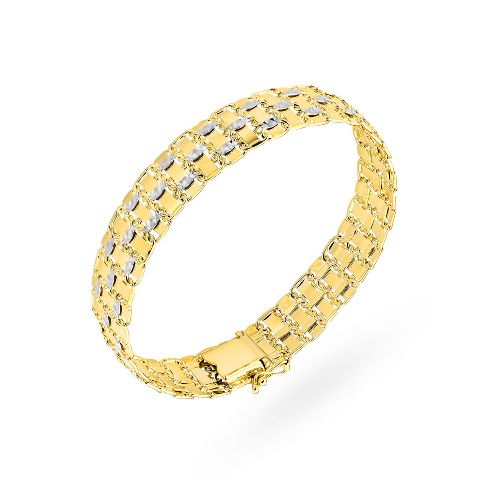 Elegancka i stylowa złota bransoletka próby 585 z kolekcji „PIATTO”.Bransoletki płaskie, zdobione diamentowaniem doskonale sprawdzą się jako ozdoba eleganckiej kreacji. Doskonała jako prezent z okazji, imienin, urodzin, bierzmowania czy też innej ważnej uroczystości. Ozdoba eleganckiej kreacji.