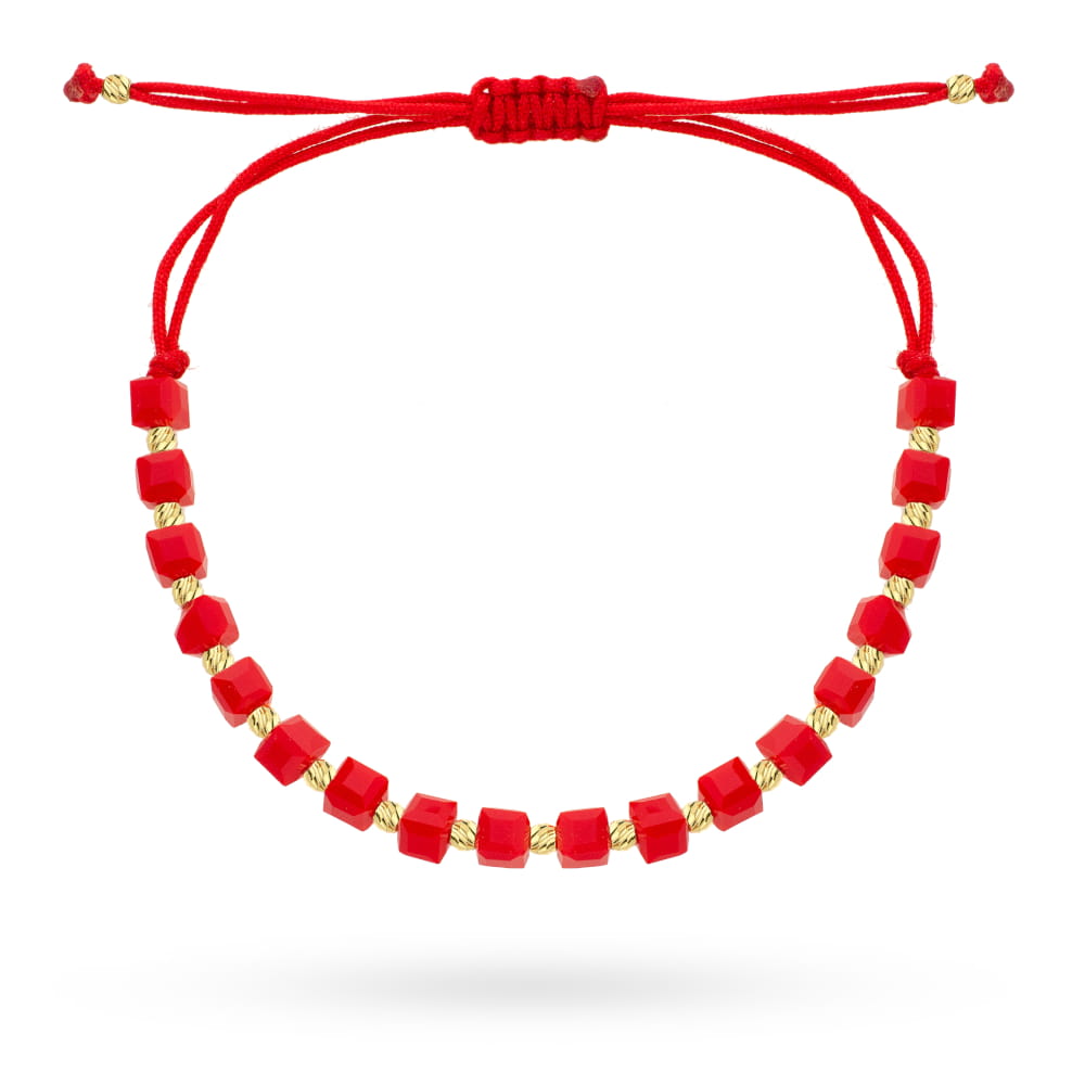 Precyzyjnie wykonana złota celebrytka bransoletka próby 585. Modne czerwone kamienie przeplatane złotymi diamentowanymi kulkami na czerwonym sznurku. Płacisz jedynie za złoto.