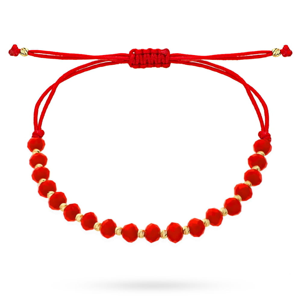 Precyzyjnie wykonana złota bransoletka próby 585 na czerwonym sznurku. Modne czerwone kamienie przeplatane złotymi diamentowanymi kulkami na czerwonym sznurku. Płacisz jedynie za złoto.