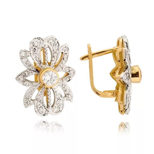 Kolczyki wykonane ze złota próby 0,333 lub 0,585 w kolorze żółtym, białym lub różowym. Ozdobione kamieniami naturalnymi lub laboratoryjnymi, takimi jak diamenty, cyrkonie lub kamienie barwne. Staranna oprawa zapewnia trwałość oraz piękny połysk przez lata. Doskonały wybór na prezent lub do własnej kolekcji.