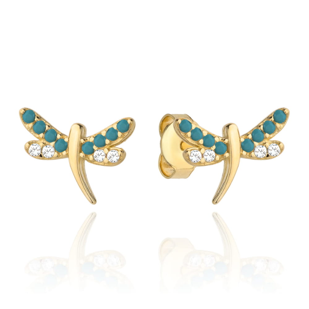 Kolczyki złota ważka wysadzana turkusowymi kamieniami i cyrkoniami