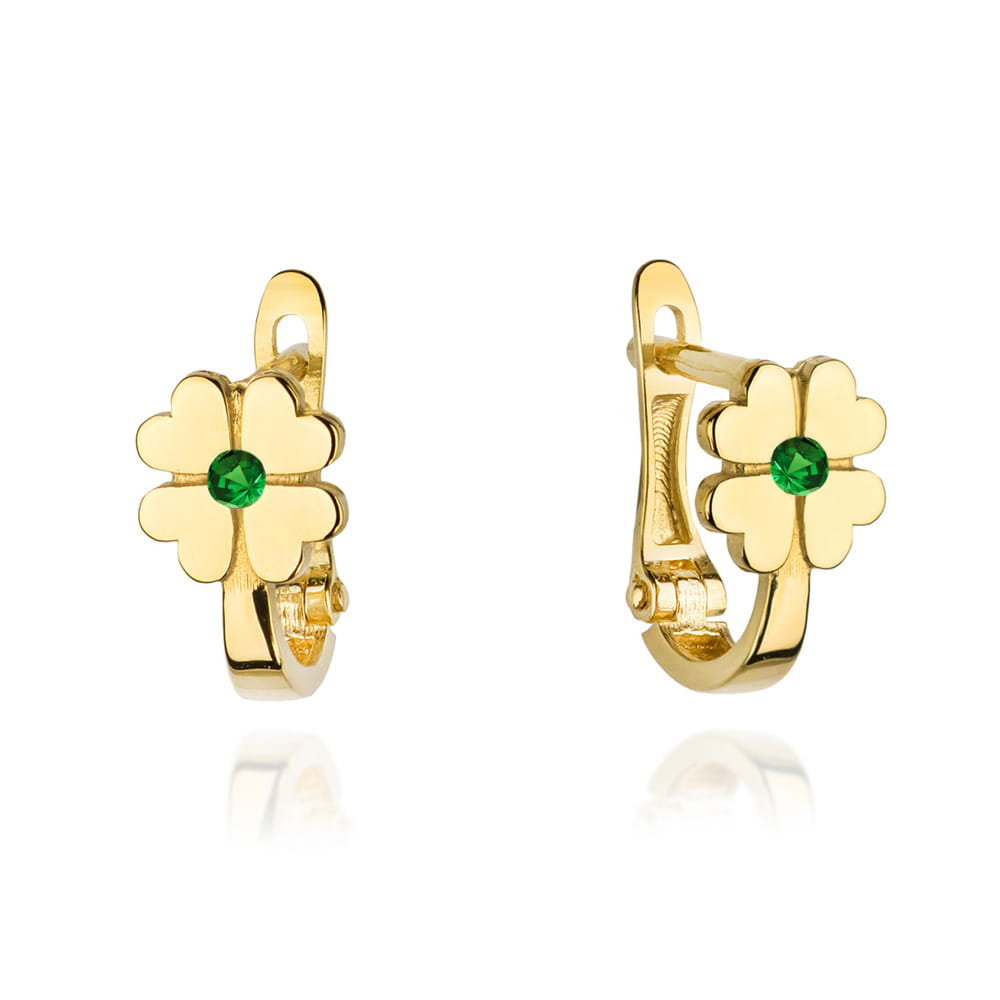 Kolczyki złote czterolistna koniczyna z zieloną cyrkonią