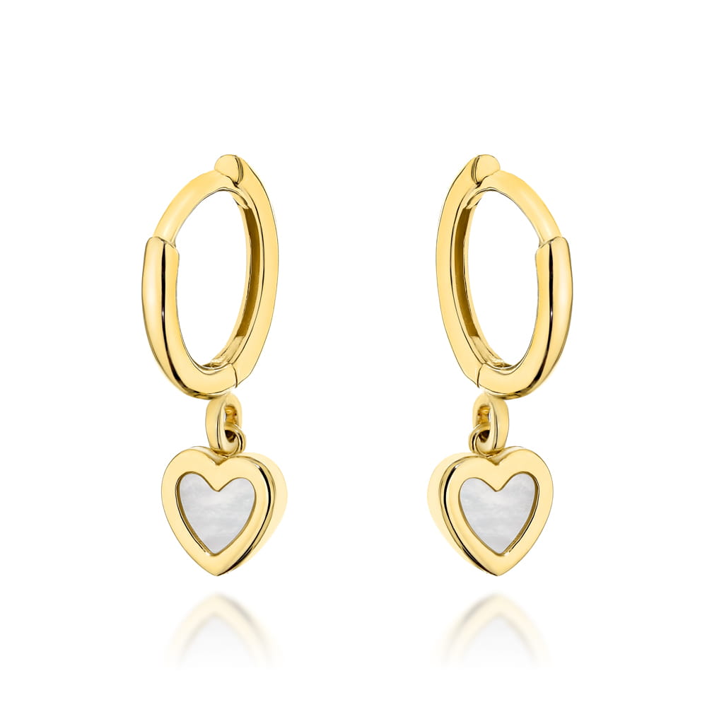 Kolczyki złote kółeczko z wiszącym serduszkiem z masą perłową