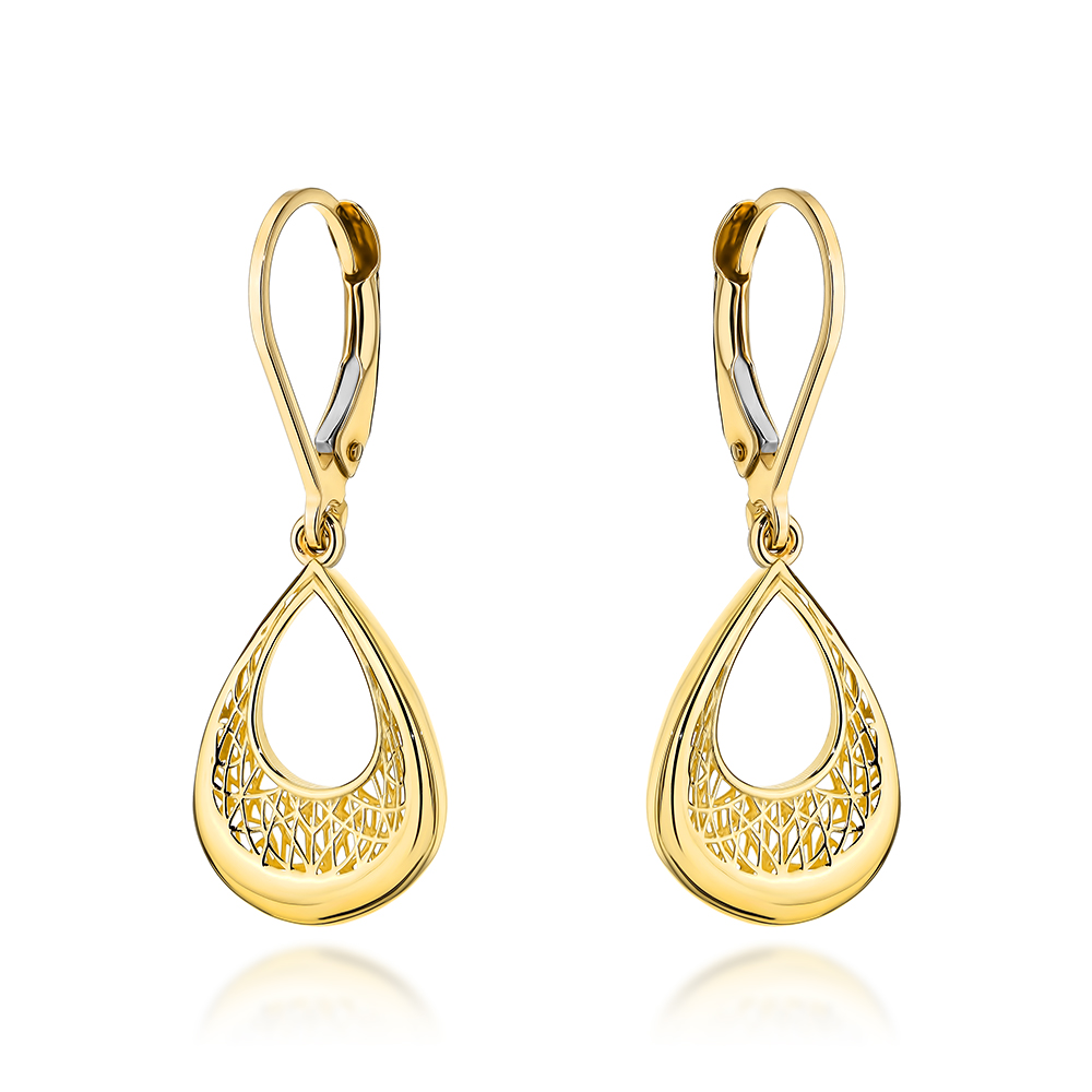 Precyzyjnie wykonane złote kolczyki próby 585.Tył kolczyka ma pełną ażurową konstrukcję.Doskonałe jako prezent lub jako ozdoba codziennej stylizacji.