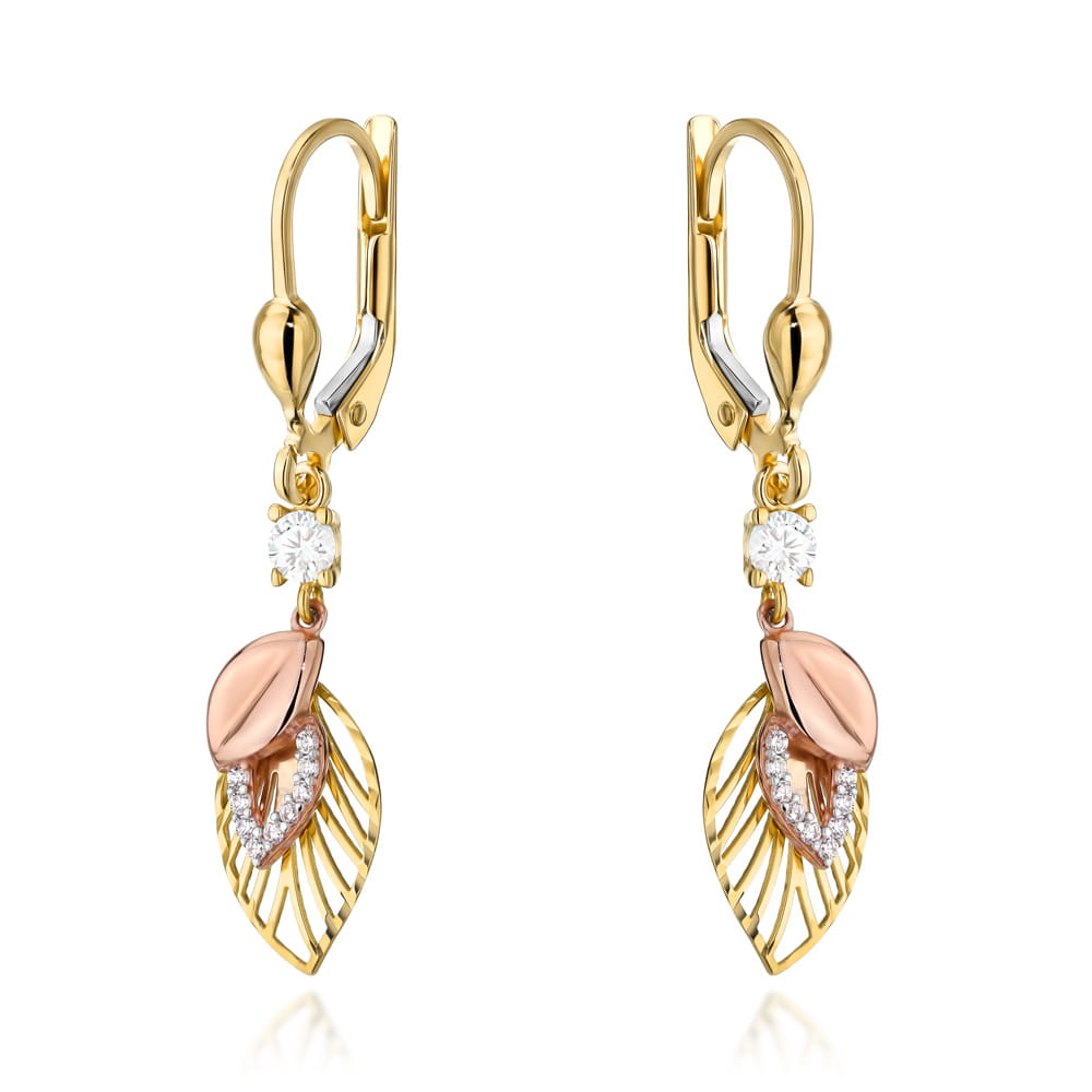 Kolczyki złote listki zdobione cyrkoniami w trzech kolorach złota