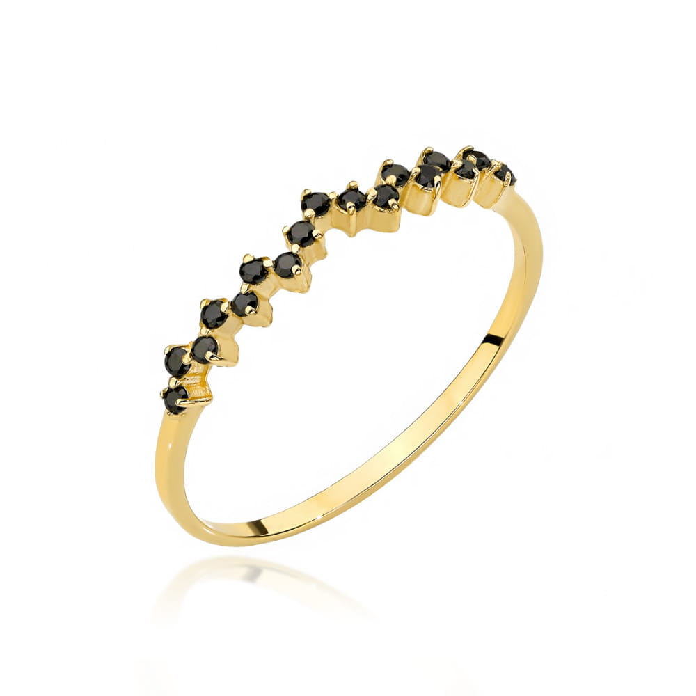 Precyzyjnie wykonany złoty pierścionek próby 585 z czarnymi kamieniami.