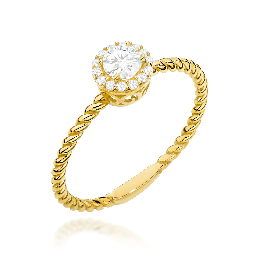 Pierścionek złoty z centralną cyrkonią w oprawie mniejszych na plecionej szynie