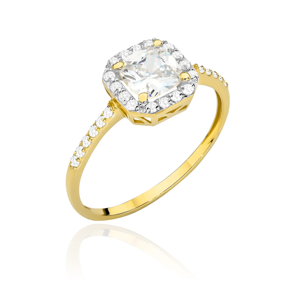 Pierścionek złoty z kwadratowym kamieniem, cyrkoniami i rodowaniem