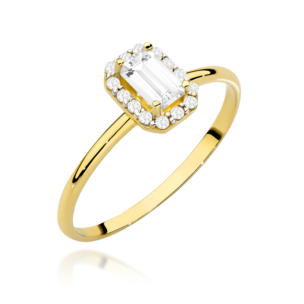 Pierścionek złoty z prostokątnym kamieniem w oprawie cyrkonii