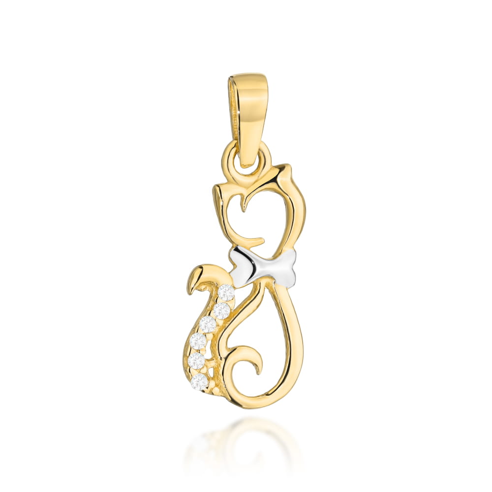 Precyzyjnie wykonana zawieszka próby 585 w kształcie kotka z cyrkoniami i elementami w białym złocie.