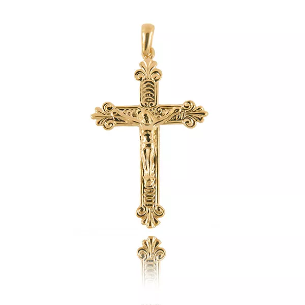 Ponadczasowy motyw religijny wykonany ze szlachetnego złota o eleganckim połysku.